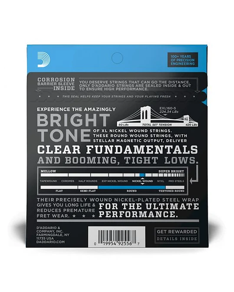 Las cuerdas XL Nickel son el estándar de la industria en cuerdas para bajos eléctricos. Con sus fundamentos claros, bajos ajustados en auge y construcción confiable de D'Addario, los bajistas de todo el mundo confían en ellos para manejar cualquier rendimiento. Las cuerdas de bajo XL Nickel están fabricadas con un núcleo de acero con alto contenido de carbono y enrolladas con alambre de acero niquelado, para un tono brillante constante y una jugabilidad suave, ideales para una amplia variedad de estilos de bajo. Hecho para bajos de 5 cuerdas, este conjunto 50-135 Medium tiene una tensión más alta, lo que brinda una mayor respuesta y salida de gama baja.